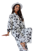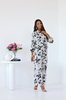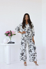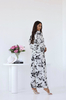 z kobiecym stylem. Uszyty z lekkiego, oddychającego materiału w odcieniu ecru, ozdobiony efektownym czarnym, kwiatowym wzorem – idealny