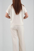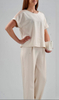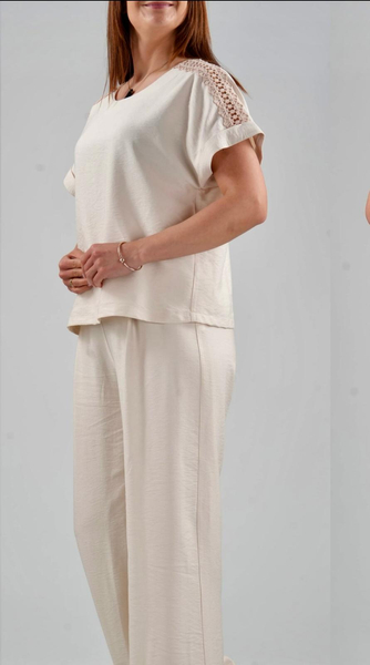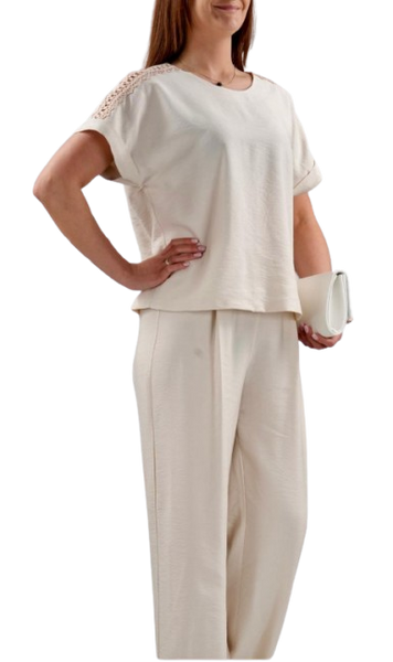 Poznaj wyjątkowy komplet marki Ksara, który łączy w sobie kobiecą delikatność i nienachalną elegancję. Składający się z lekkiej bluzki z romantycznymi, ażurowymi wstawkami oraz szerokich, lejących spodni, ten zestaw to idealna propozycja dla kobiet ceniących komfort, styl i klasę.