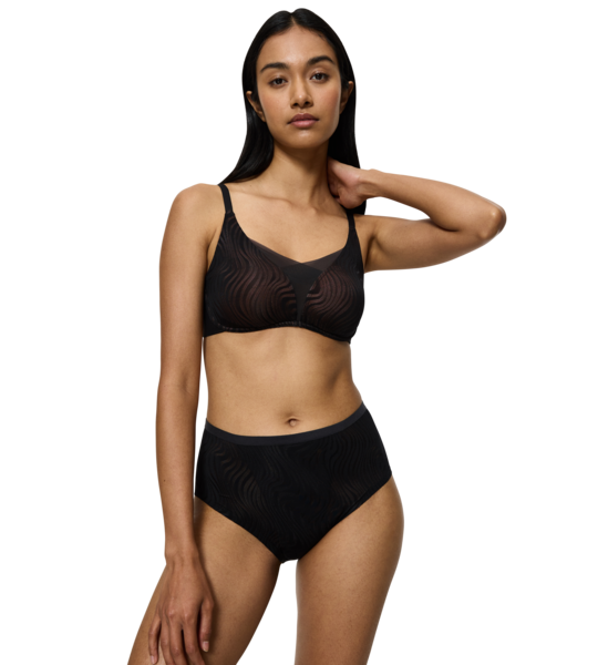 Innowacyjny biustonosz, który łączy funkcjonalność z eleganckim designem. Ozdobiony żakardową siateczką o falistym wzorze, zapewnia lekkość, a jednocześnie doskonałe wsparcie oraz wygładzenie pleców i pach. Wykonany z certyfikowanego poliamidu z recyklingu (GRS), wpisuje się w ideę świadomej mody i ekologicznych rozwiązań.