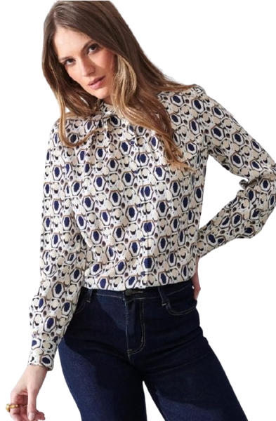 • Bluzka z efektownym geometrycznym wzorem w odcieniach granatu, beżu i écru