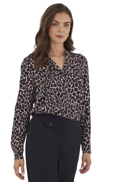 Stylowa bluzka ze stójką i efektownym nadrukiem w nowoczesną wersję zwierzęcego wzoru. Ozdobne patki z przodu i pagony na ramionach. Prosty krój z długim rękawem sprawia, że model świetnie sprawdzi się zarówno w biurze, jak i podczas spotkań towarzyskich. Wykonana z przyjemnej w dotyku wiskozowej tkaniny, która zapewnia komfort noszenia przez cały dzień.