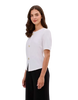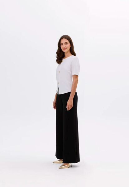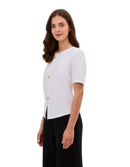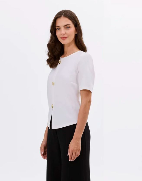 Minimalistyczna, a jednocześnie wyjątkowo elegancka bluzka o prostym kroju z krótkim rękawem. Została ozdobiona efektownymi guzikami w złotym kolorze, które nadają całości szlachetnego wyrazu. Dekolt w łódkę subtelnie podkreśla linię szyi, a lekko taliowany fason pięknie układa się na sylwetce. To idealna baza do wielu stylizacji – zarówno biurowych, jak i wizytowych. Ozdobne guziki przyszyte są do specjalnej podkładki, którą można w dowolnym momencie wsadzić oraz wyjąć pozostawiając bluzkę bez bądź z guzikami. Kolor biały i czarny.