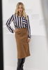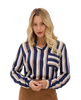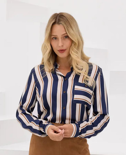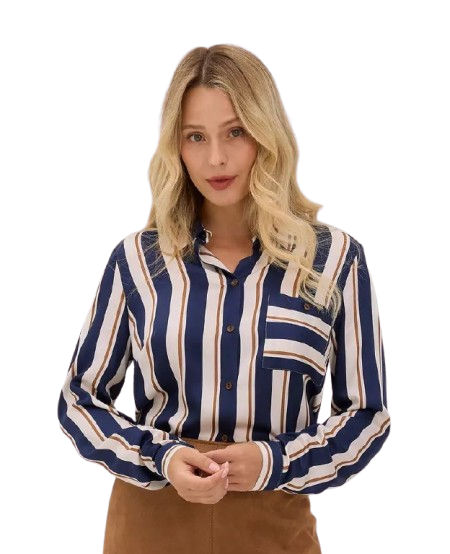 Klasyczna koszula z kołnierzykiem z wyrazistym wzorem – pionowe pasy w odcieniach granatu, karmelu i kremu. Model z długim rękawem, zapięciem na guziki i kieszonką na piersi. Koszula idealna zarówno do eleganckich jak i casualowych stylizacji.