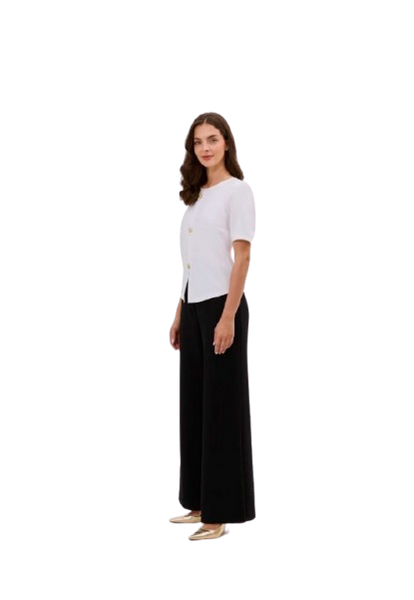 Klasyczne spodnie o szerokiej nogawce, które łączą wygodę z wyrafinowanym stylem. Wysoki stan podkreśla talię, a płynna linia spodni nadaje sylwetce lekkości i elegancji. To ponadczasowy fason, który świetnie sprawdzi się w stylizacjach biznesowych, ale również w bardziej swobodnych zestawieniach – np. z t-shirtem czy lekkim topem.