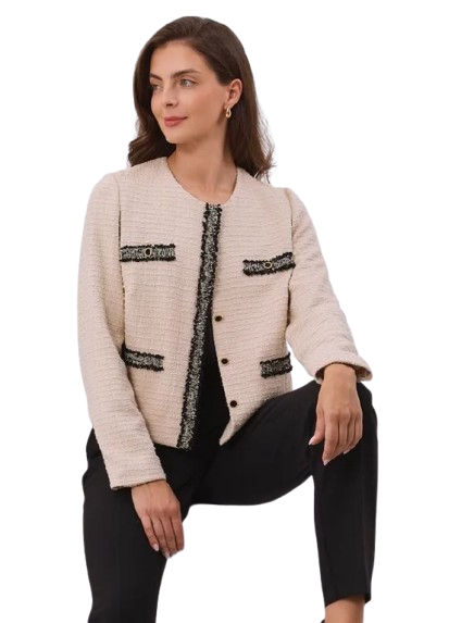SPÓDNICA W KOLORZE BEŻOWYM, JAK ŻAKIET Elegancka, dopasowana spódnica o klasycznej długości do kolan, wykonana z wysokogatunkowej tkaniny typu chanel. Prosty, kobiecy fason pięknie podkreśla sylwetkę, a delikatna faktura materiału dodaje szyku. Model idealny do zestawów biurowych i formalnych – szczególnie w duecie z pasującą marynarką z tej samej kolekcji. Występuje w kolorze czarnym i beżowym.