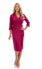 Elegancka sukienka o długości midi. Kopertowy krój, dekolt V z kołnierzem, ozdobna metalowa klamra z boku pięknie podkreślająca talię. Rękaw 3/4 zakończony mankietem z rozcięciem. Model łączy klasykę z kobiecą nowoczesnością- to idealna sukienka na przyjęcia, uroczystości i wyjątkowe okazje. Dostępna w kolorze fuksji i beżu ze złotym połyskiem.