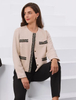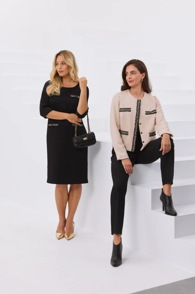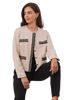 Krótki, pudełkowy żakiet w stylu Chanel z fakturowanej tkaniny. Ozdobiony kontrastową taśmą i dekoracyjnymi patkami. Zapięcie na ozdobne guziki. Do żakietu można dokupić osobno ołówkową spódnicę w tej samej tkaninie.