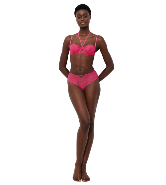 Szykowny, a jednocześnie uwodzicielski. Zaprojektowaliśmy ten biustonosz typu balkonetka z minimalną powierzchnią krycia, aby podkreślić dekolt. Graficzny wzór koronki i seksowny detal pośrodku dodają jeszcze większej elegancji.