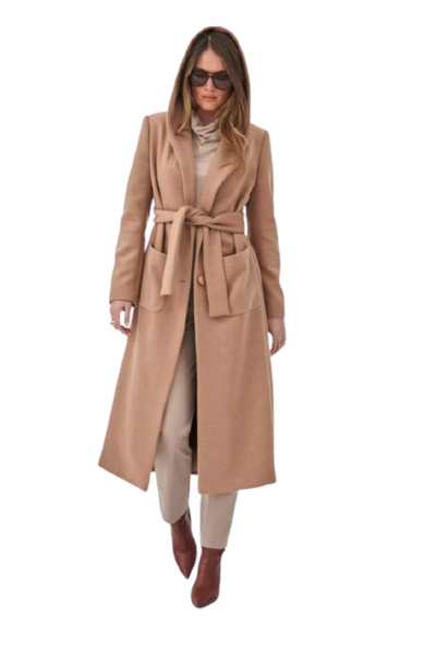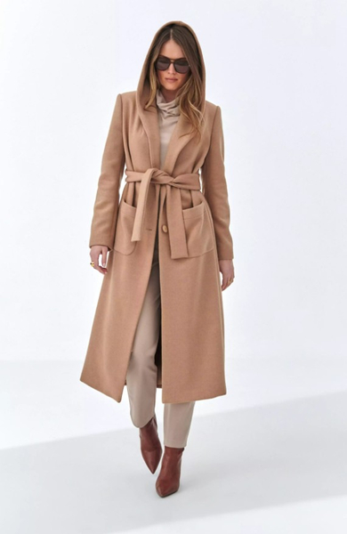 Beżowy płaszcz z kapturem to kwintesencja nowoczesnej elegancji – idealny zarówno do pracy, jak i na co dzień.