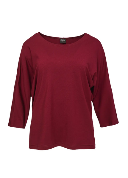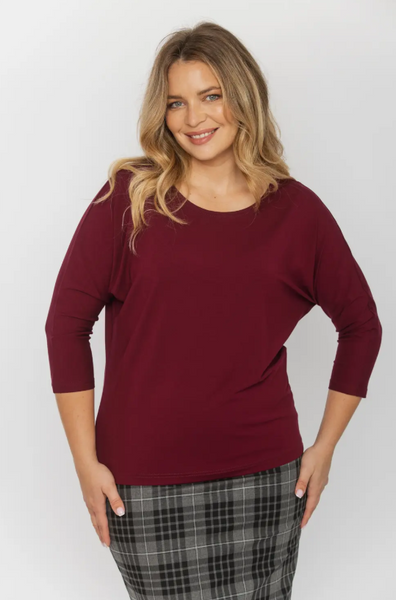 Uniwersalna i wygodna bluzka w odcieniu czerwonego wina to idealna baza do wielu stylizacji. Luźniejszy krój typu nietoperz zapewnia swobodę ruchów i komfort noszenia, a przyjemna w dotyku dzianina z wiskozą gwarantuje dobrą cyrkulację powietrza. Klasyczny, okrągły dekolt i rękawy 7/8 nadają jej ponadczasowy charakter. Bez nadruków, zbędnych ozdób – prosta i stylowa.