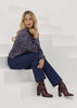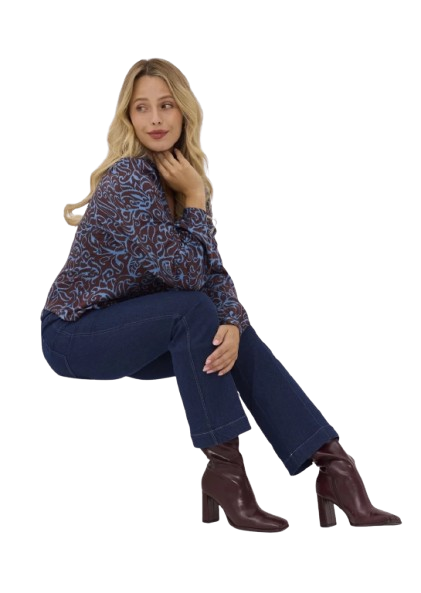 Model zachwyca oryginalnym połączeniem niebiesko-czekoladowych wzorów, które dodają stylizacji wyrazistości i nowoczesnego charakteru. Dekolt w szpic subtelnie podkreśla szyję, a całość uzupełniają czekoladowe guziczki, nadające bluzce eleganckiego wykończenia.
