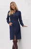 Sukienka posiada kołnierzyk i zapięcie na zamek, a długie rękawy zakończone mankietami dodają całości elegancji. Kieszenie w szwach bocznych zapewniają praktyczność, natomiast ozdobne przeszycia z przodu i rozcięcia po bokach nadają sukience nowoczesnego charakteru.