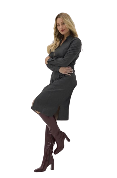 Ta grafitowa sukienka jeansowa Salko to idealny wybór zarówno do pracy, jak i na spotkania czy codzienne wyjścia, łącząc komfort noszenia z ponadczasowym stylem.