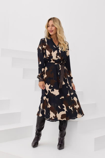 Stylowa sukienka midi polskiej marki Salko to elegancki model wykonany z 100% wiskozy, dzięki czemu jest lekka, lejąca i komfortowa w noszeniu. Zwierzęcy print w odcieniach beżu, czerni i brązu nadaje sukience nowoczesnego, a zarazem ponadczasowego charakteru.