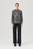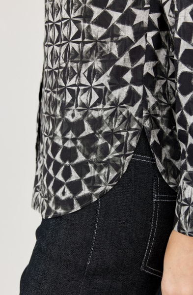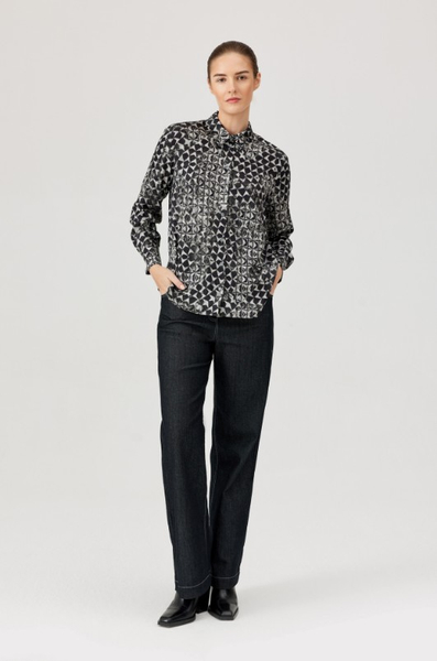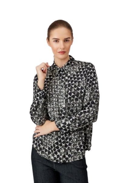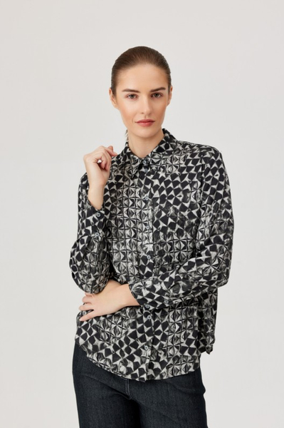 Koszula z geometrycznym printem – nowoczesny akcent w klasycznej formie. Stylowa koszula z kołnierzykiem wykonana z lekkiej, przyjemnej w dotyku tkaniny wiskozowej, ozdobiona wyrazistym geometrycznym wzorem w odcieniach czerni, bieli i szarości. Model o prostym kroju, zapinany na guziki na całej długości, z długim rękawem i mankietem zakończonym guzikiem. Koszula świetnie sprawdzi się zarówno w stylizacjach biurowych, jak i w zestawieniach casualowych – idealna do czarnych spodni, jeansów czy pod marynarkę.