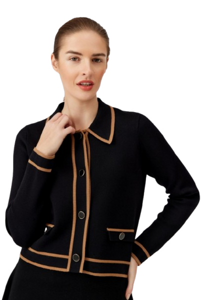 Stylowy, dzianinowy żakiet w czerni, wykończony efektowną, karmelową lamówką.