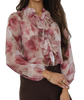 Bluzka zapinana jest na guziki, a jej wyjątkowego charakteru nadają ozdobne falbany wzdłuż linii dekoltu oraz zapięcia. Długi rękaw zakończony gumką zapewnia wygodę i estetyczne wykończenie. Ciekawy print sprawia, że model jest niepowtarzalny i świetnie wpisuje się w aktualne trendy.