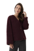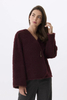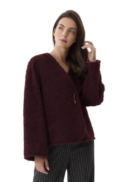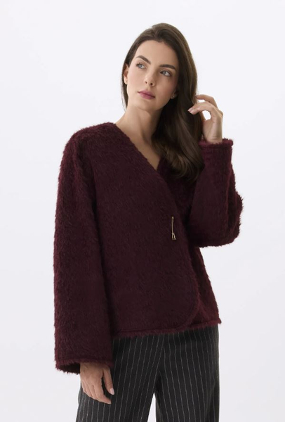 Krótkie okrycie wierzchnie o swobodnym kroju, wykonane z miękkiej, futerkowej dzianiny w kolorze burgundowym. Model zapinany na ozdobną agrafkę.