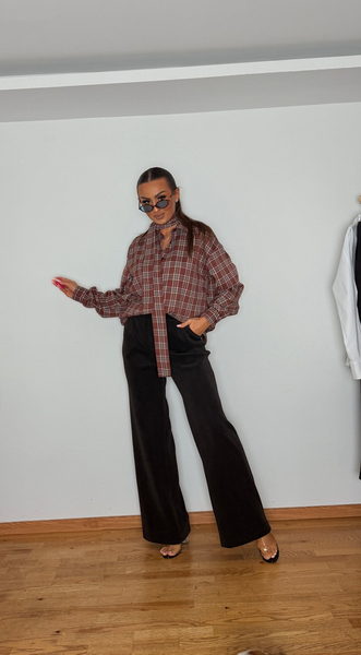 Detale takie jak starannie wykonane obszycia i jednolity odcień głębokiego brązu sprawiają, że spodnie prezentują się minimalistycznie, ale z wyraźnym akcentem faktury charakterystycznej dla sztruksu.
