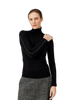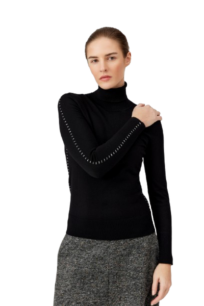 Golf z kontrastowym wykończeniem – subtelna elegancja z nutą nowoczesności. Minimalistyczny golf w kolorze głebokiej czerni, wykonany z miękkiej, przyjemnej w dotyku dzianiny wiskozowo-bawełnianej. Model ma dopasowany fason z klasycznym golfem i długim rękawem. Uwagę przyciągają kontrastowe, białe przeszycia wzdłuż boków, rękawów i ramion, które dodają mu wyjątkowego charakteru. Świetny wybór zarówno do stylizacji biurowych, jak i casualowych – idealnie komponuje się z prostymi spodniami, spódnicami czy marynarką.