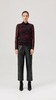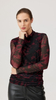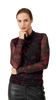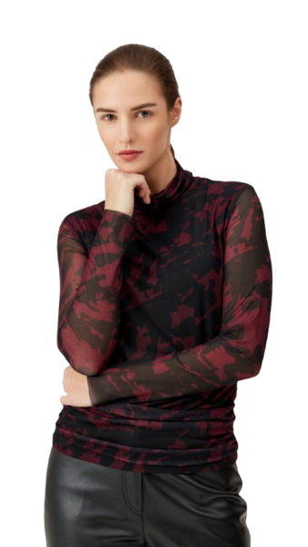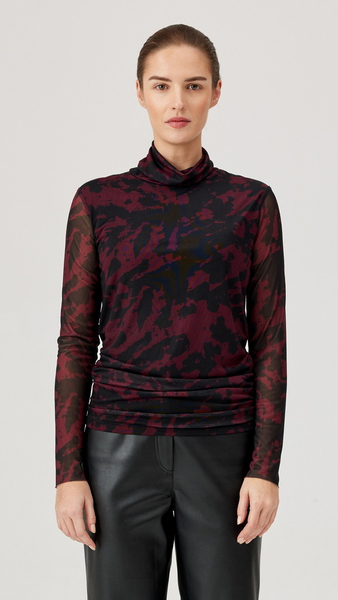 Bluzka FÉRIA z nadrukiem z lekkiej, elastycznej siatki w oryginalny abstrakcyjny print w odcieniach czerni i burgundu. Ma luźny fason, długi rękaw i miękko układający się golf. Podsiada gładkie czarne podszycie. Boki wykończone są marszczeniami, które nadają całości dynamicznego charakteru i optycznie modelują sylwetkę. Świetna do codziennych i weekendowych stylizacji – doskonale komponuje się z gładkimi spodniami lub spódnicą. Idealny wybór dla kobiet, które lubią wygodę z nutą artystycznego wyrazu.