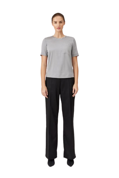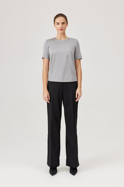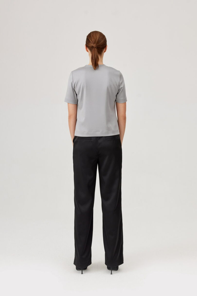 Spodnie FÉRIA z satynowym połyskiem – elegancja i komfort w jednym. Czarne spodnie z lekkiej, miękko układającej się tkaniny o satynowym wykończeniu. Posiadają prostą nogawkę, zaprasowanie na kant oraz elastyczny pas z tyłu, który zapewnia wygodę noszenia. Z tyłu dwie ozdobne kieszenie z wypustką. Idealne do stylizacji wieczorowych i eleganckich – doskonale komponują się z szykowną bluzką, marynarką lub topem z połyskiem. Stylowy wybór na wyjątkowe okazje i formalne spotkania.