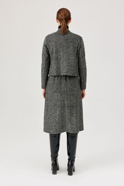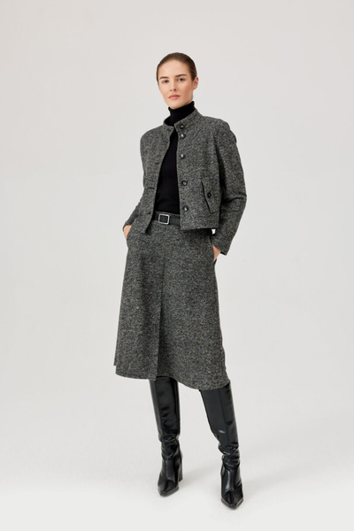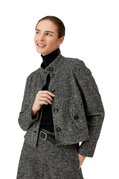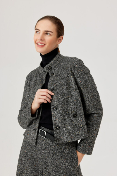 nowoczesnym wydaniu. Stylowy, wełniany żakiet o krótkim kroju wykonany z tkaniny
