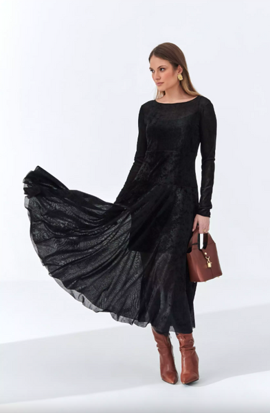 Subtelnie transparentna tkanina z welurowym chwytem tworzy hipnotyzujący efekt, który przyciąga spojrzenia przy każdym ruchu.