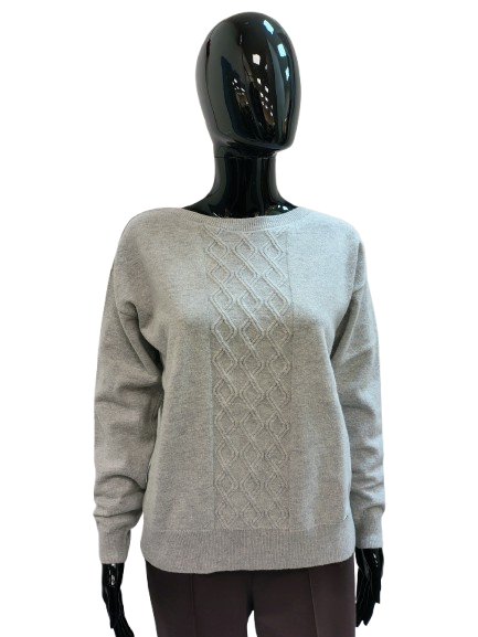 Ozdobny aranowy splot dodaje mu wyjątkowego charakteru, podkreślając staranne wykonanie i dbałość o detale. Klasyczny okrągły dekolt sprawia, że sweter jest uniwersalny i doskonale komponuje się zarówno z jeansami, jak i spódnicą czy eleganckimi spodniami.