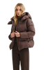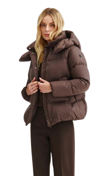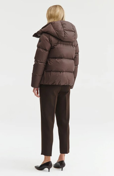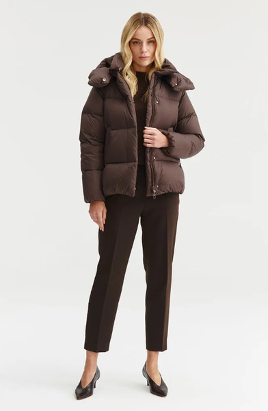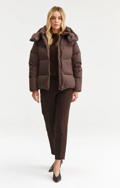 Krótka kurtka wypełniona naturalnym puchem kaczym. Dwukierunkowy suwak z przodu. Stójka oraz kaptur dopinany na napy. W dole kurtki i dołach rękawów wszyta lekko marszcząca gumka.