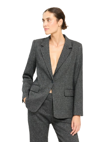 Czarna marynarka o dopasowanym kroju to klasyka w nowoczesnym wydaniu. Wzór w jodełkę dodaje jej subtelnej faktury i wyrafinowanego charakteru, idealnego zarówno do biura, jak i na specjalne okazje.