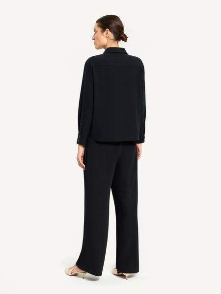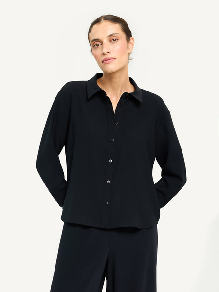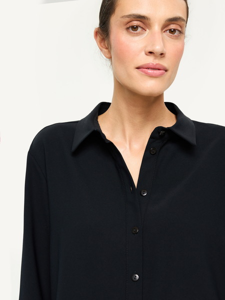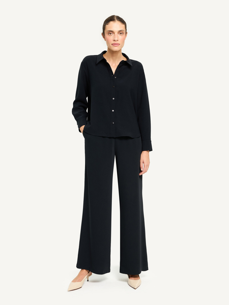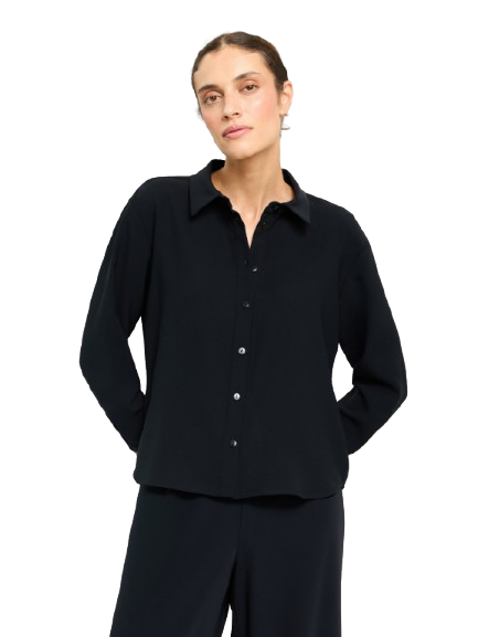 Prosta i elegancka czarna bluzka to doskonała propozycja na każdą okazję – od biura po spotkania po godzinach. Zapięcie na guziki oraz klasyczny kołnierzyk nadają jej ponadczasowego charakteru, a gładka faktura tkaniny prezentuje się stylowo i schludnie.