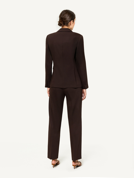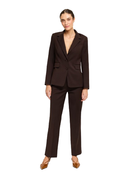Eleganckie spodnie w głębokim, brązowym odcieniu to klasyka damskiej garderoby biurowej. Uszyte z wysokiej jakości tkaniny z dodatkiem wełny zapewniają komfort noszenia i trwałość.