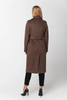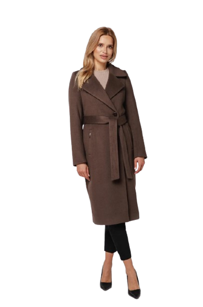 Długi, dopasowany płaszcz z domieszką alpaki i wełny to kwintesencja klasy i komfortu. Miękki w dotyku, ocieplany i wykończony podszewką – zapewnia ciepło nawet w chłodne zimowe dni. Klasyczny kołnierz z klapami i pasek w talii pięknie modelują sylwetkę, a subtelny rozporek z tyłu dodaje lekkości całej formie.