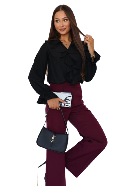 Bluzka MOLLY w klasycznym czarnym kolorze to stylowa propozycja, która stanie się idealną bazą do wielu Twoich stylizacji. Model wyróżnia się dekoltem w szpic z ozdobnymi falbanami, które dodają kobiecości i lekkości. Bluzka jest zapinana na guziki, co pozwala dopasować jej wygląd do okazji – od biura po wieczorne wyjście.