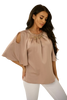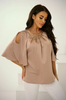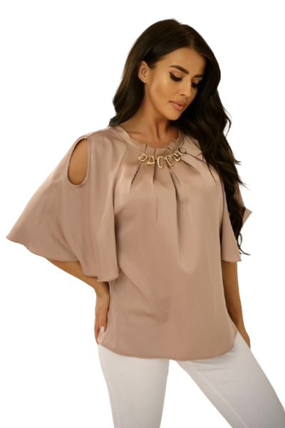 Model wyróżnia się krótkim, poszerzanym rękawem z ozdobnym wycięciem na ramieniu, które dodaje całości lekkości i kobiecego charakteru. Dekolt ozdobiony złotym łańcuszkiem oraz delikatna stójka wykończona falbanką nadają bluzce elegancki, biżuteryjny akcent – idealny zarówno do pracy, jak i na wyjątkowe okazje.