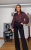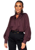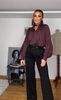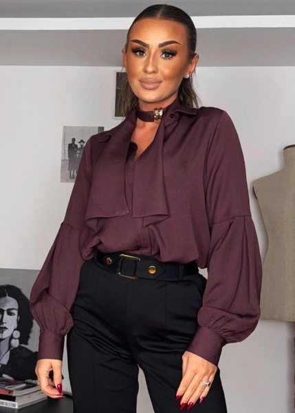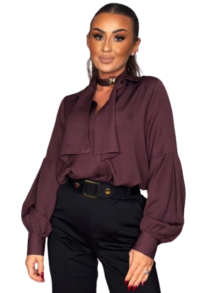 Elegancka koszula uszyta z lekkiego, gładkiego materiału o matowym wykończeniu. Model charakteryzuje się klasycznym kołnierzykiem i długimi rękawami zakończonymi szerokim mankietem z guzikami. Rękawy posiadają delikatne marszczenia przy ramionach i mankietach, które dodają całości subtelnej objętości.