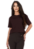Model posiada okrągły dekolt wykończony wąską lamówką, która estetycznie przylega do szyi, zachowując czystość formy. Rękawy krótkie, o prostym fasonie, bez wywinięć czy dodatkowych przeszyć.