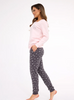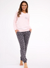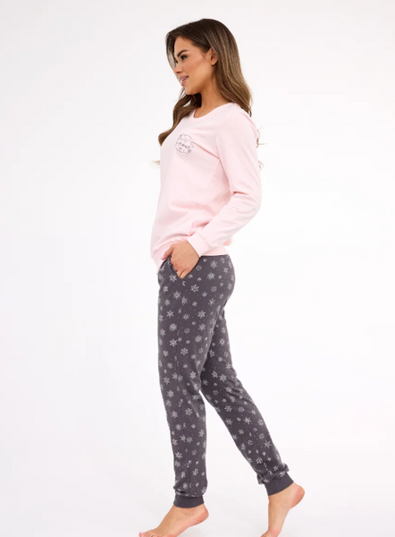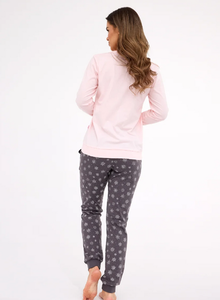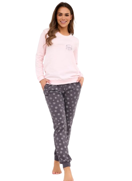 Piżama damska – różowa góra z haftem i szare spodnie w śnieżynki
