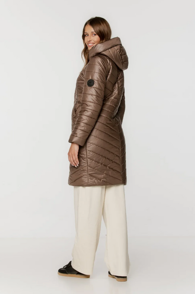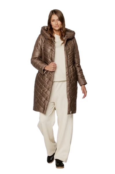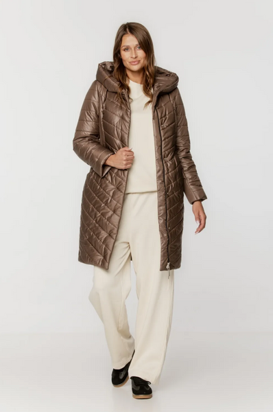 Pikowana, długa kurtka Kaja o taliowanym fasonie, który pięknie podkreśla sylwetkę. Wykonany z wysokiej jakości materiałów. Zapinany na zamek oraz zatrzaski w kolorze srebrnym. Po bokach kieszenie.. Model posiada podszewkę oraz wypełnienie syntetyczne.