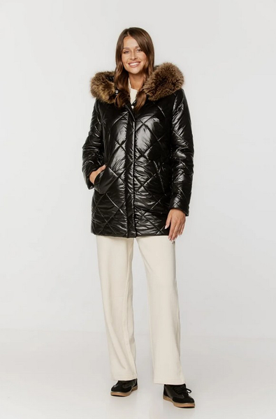 Pikowana, krótka kurtka Nadia o luźnym fasonie. Wykonana z wysokiej jakości materiałów. Zapinana na zamek oraz zatrzaski w kolorze srebrnym. Po bokach kieszenie. Kaptur wykończony futerkiem. Model posiada podszewkę oraz wypełnienie syntetyczne.