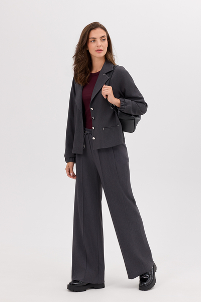 Stylowe spodnie o szerokiej nogawce i średnim stanie to propozycja dla kobiet, które cenią elegancję w nowoczesnym, wygodnym wydaniu. Model z dekoracyjnym, stebnowanym kantem pięknie wydłuża sylwetkę, a regulowany troczek w pasie pozwala idealnie dopasować spodnie do figury. Dodatkowym atutem są praktyczne boczne kieszenie, które podkreślają ich casualowo-elegancki charakter.