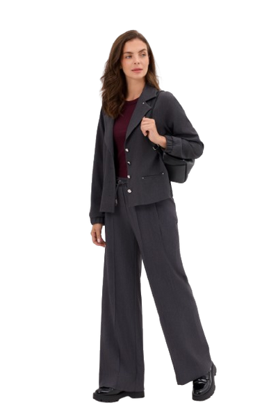 Marynarka została uszyta z gładkiej, wysokiej jakości tkaniny w modnym grafitowym odcieniu, co sprawia, że świetnie komponuje się z wieloma stylizacjami. Doskonale współgra ze spodniami z tej samej tkaniny (kod artykułu: 235/5), tworząc spójny i nowoczesny komplet.