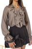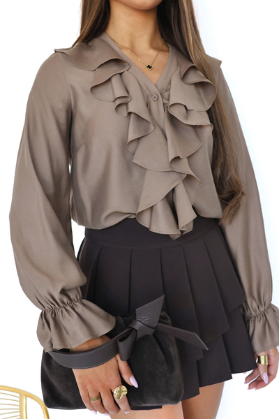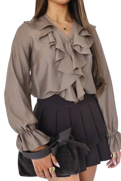 Bluzka MOLLY w klasycznym beżowym kolorze to stylowa propozycja, która stanie się idealną bazą do wielu Twoich stylizacji. Model wyróżnia się dekoltem w szpic z ozdobnymi falbanami, które dodają kobiecości i lekkości. Bluzka jest zapinana na guziki, co pozwala dopasować jej wygląd do okazji – od biura po wieczorne wyjście.