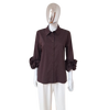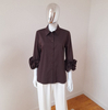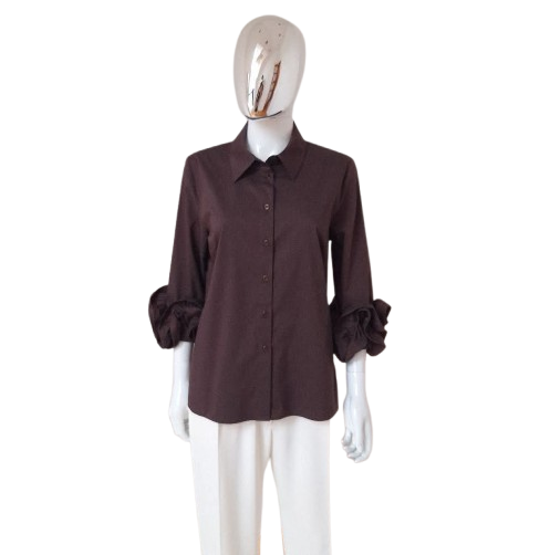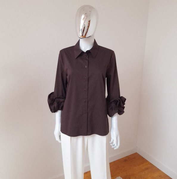 Czekoladowa koszulka damska KSARA – klasyczny kołnierzyk, rękaw 3/4 i falbanki typu „beza”