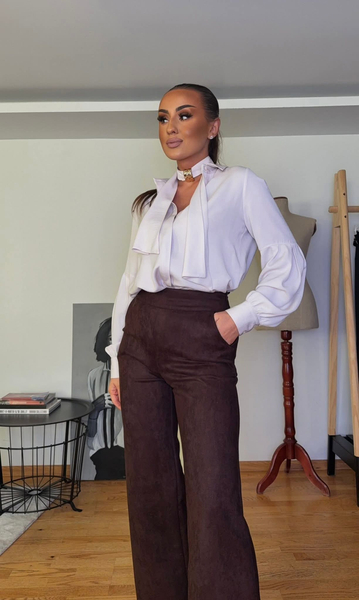 Elegancka koszula uszyta z lekkiego, gładkiego materiału o matowym wykończeniu. Model charakteryzuje się klasycznym kołnierzykiem i długimi rękawami zakończonymi szerokim mankietem z guzikami. Rękawy posiadają delikatne marszczenia przy ramionach i mankietach, które dodają całości subtelnej objętości.