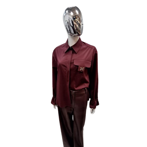 Model wyróżnia się lekko oversizowym fasonem oraz obniżoną linią ramion, które nadają całości swobodnego, współczesnego wyglądu. Dzięki temu bluzka doskonale sprawdzi się zarówno w stylizacjach eleganckich, jak i smart casual. Na przodzie znajduje się ozdobny emblemat na kieszonce, który dodaje bluzce nowoczesnego, modnego charakteru i przełamuje jej gładką formę.