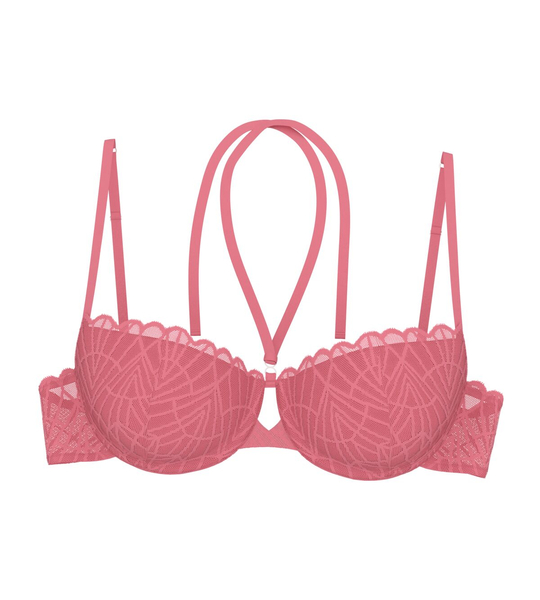 - Design: Biustonosz wyróżnia się nowoczesnym, imprezowym stylem, łączącym elegancką graficzną koronkę z przezroczystymi panelami z siateczki. Detale te nadają mu uwodzicielskiego charakteru.