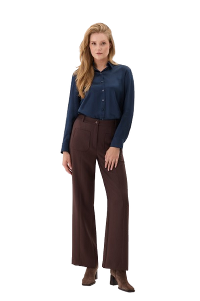 Eleganckie spodnie marki Salko w kolorze gorzkiej czekolady to propozycja, która łączy klasykę z nowoczesnym designem. Model z szeroką nogawką i ozdobnymi przeszyciami optycznie wysmukla sylwetkę, a naszywane kieszenie z przodu dodają stylowego charakteru.