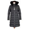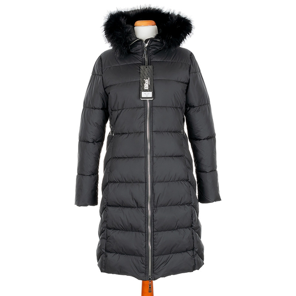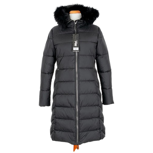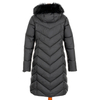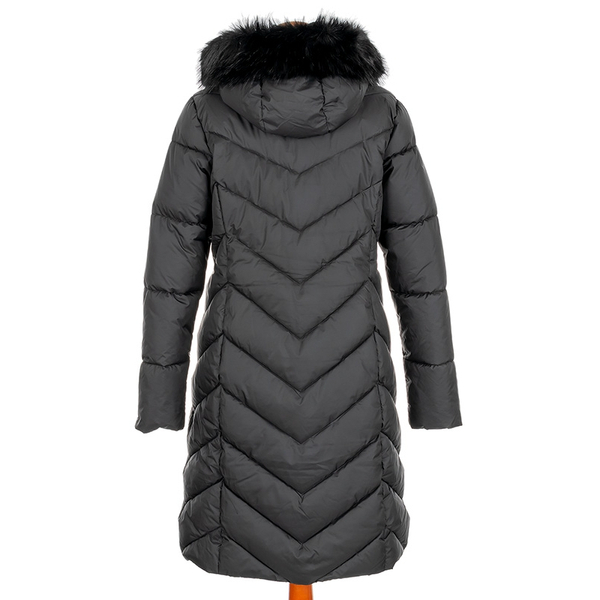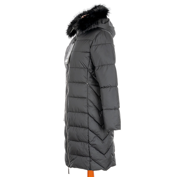 Długi, pikowany płaszcz zapinany na dwustronny zamek pod samą szyję. Ma nieodpinany, niewielki kaptur obszyty futerkiem. Rękawy wykończone są listwą wiatrołapową, a taliowanie pięknie podkreśla sylwetkę. W bocznych szwach znajdują się ukryte kieszenie na zamek.